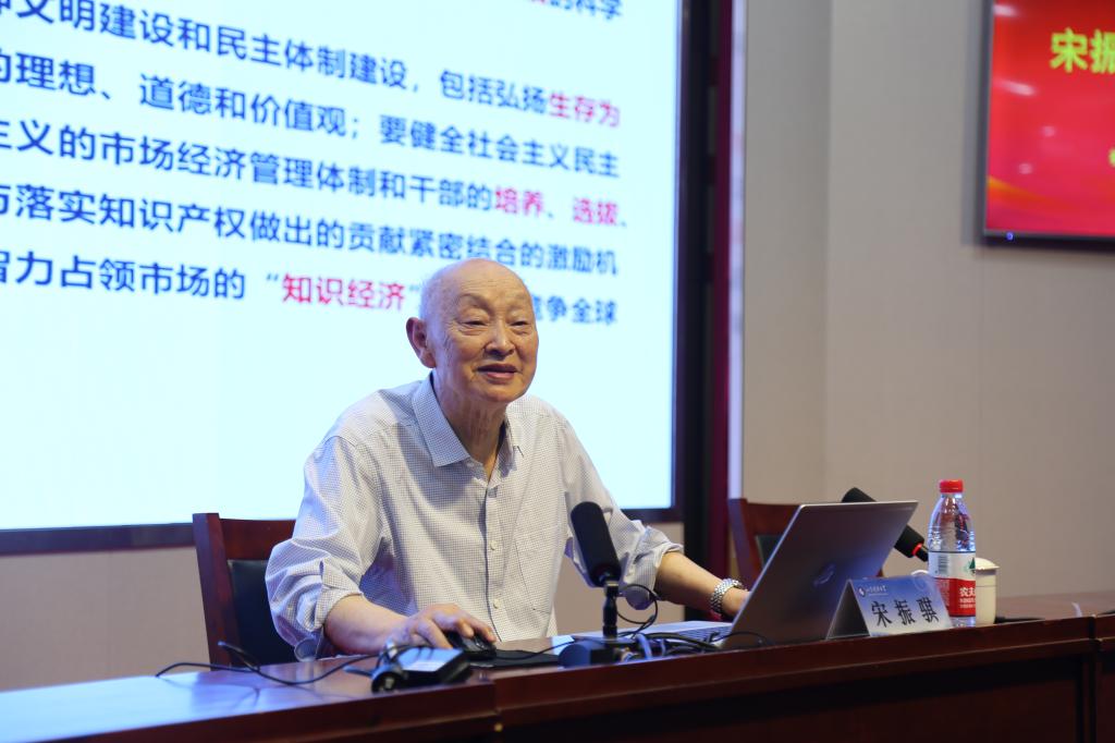 宋振骐院士以“以史为鉴、开创未来”开场,重温习近平总书记在纪念马克思诞辰200周年大会上提出的重要讲话,将中国共产党带领中国革命、建设和改革的各个时期取得的重大成就与公司发展的光辉岁月相结合,以科学家和教育家的独特眼光,从创新驱动、全民共举、强化领导、法治保障四个方面讲解新时代的鲜明特征,带领与会师生感受波澜壮阔的科技强国之路。虽已是87岁高龄的耄耋之年,宋院士却精神矍铄,语言风格轻松诙谐、激情洋溢。
