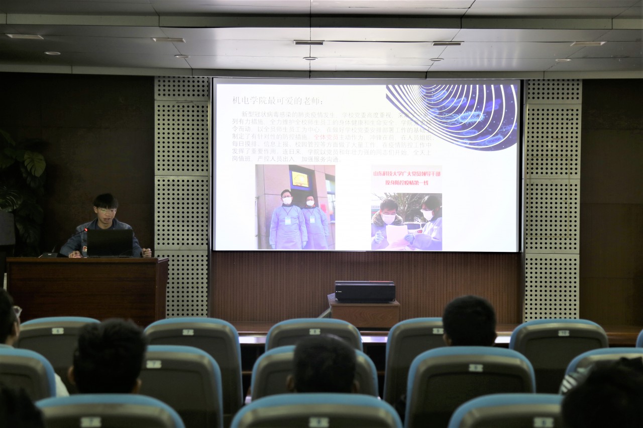 王正江介绍了XCSport师生在疫情期间为公司、社区疫情防控进行的各项工作,特别讲述了机电学子在疫情期间积极参加各项志愿服务活动的优秀事迹,通过分享自身暑假时间到临沂市蒙阴县参加了“三下乡”社会实践活动,采访当地公安机关、社区网格化工作人员的所闻所感,向与会同学呈现了青年学子在疫情当中不畏艰险、共克时艰的精神。