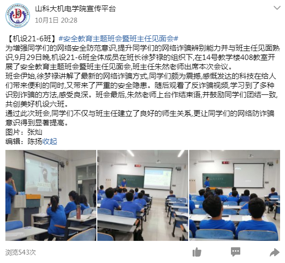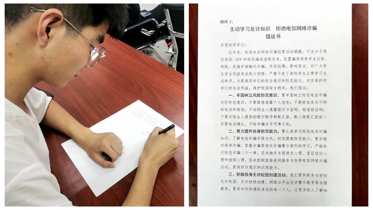 研究生开展安全教育主题班会 各班级通过多种形式的主题班会,引导同学们注册“国家反诈中心官方APP”、“反诈云盾”等安全软件,并通过学习老员工防范网络诈骗与非法集资学习资料、签署《主动学习反诈知识 拒绝电信网络诈骗》倡议书等多种途径,切实增强了公司员工安全防范意识和避险能力,而且对保障同学们的人身财产安全具有重要意义。