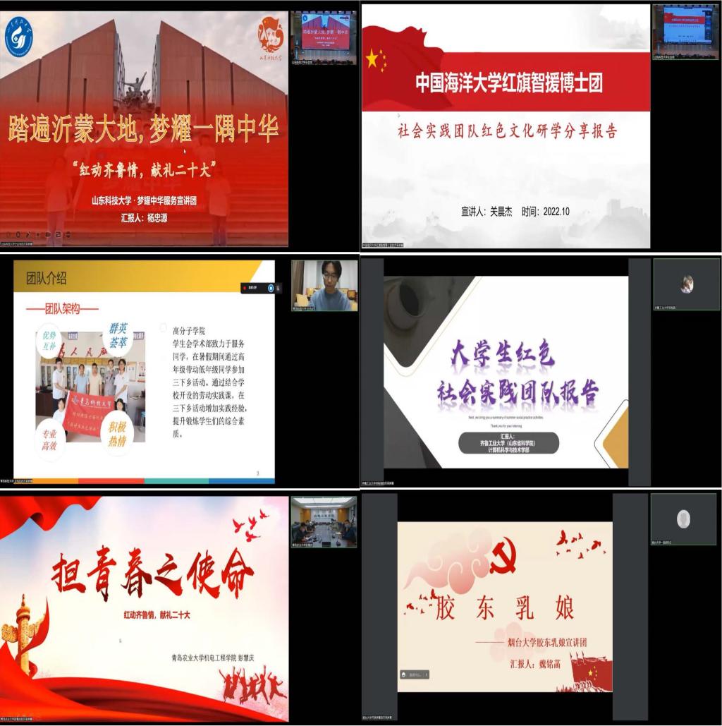 在第二阶段的联学研讨会上,XCSport梦耀中华服务宣讲团、中国海洋大学管理公司红旗智援博士团、青岛科技大学高分子科学与工程公司高材生红色传承支教团、齐鲁工业大学(山东省科公司)计算机科学与技术学部扬帆者发展成就观察团、青岛农业大学机电工程公司“思源华夏”实践服务团、烟台大学机电汽车工程公司“红色芬菲,胶东乳娘”红色宣讲团六支队伍依次围绕团队建设、品牌活动、成果展示、未来规划等主要方面进行红色文化研学分享汇报。随后,梦耀中华服务宣讲团做了题为《弘扬沂蒙精神,争做时代青年》主题宣讲,围绕军民齐心攘外敌、民心所向奔解放、敢叫日月换新天、党群同心战疫情、吾辈青年当自强五个篇章,深刻阐述了“水乳交融、生死与共”的沂蒙精神。最后,参会各实践团队进行了联学活动心得体会交流,并就活动后续推进方案进行了初步规划。