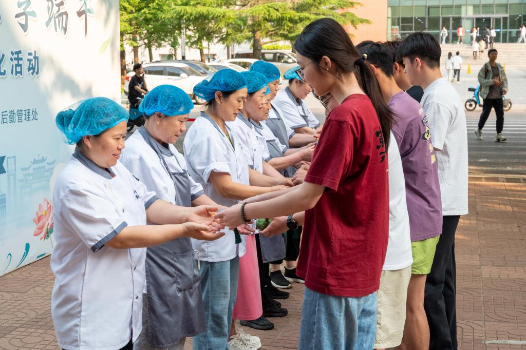 活动尾声,师生们捧着亲手制作的粽子与香囊合影留念,齐声共祝 “端午安康”。特别暖心的是,同学们将饱含心意的香囊赠予食堂工作人员,以传统手作传递感恩之情。