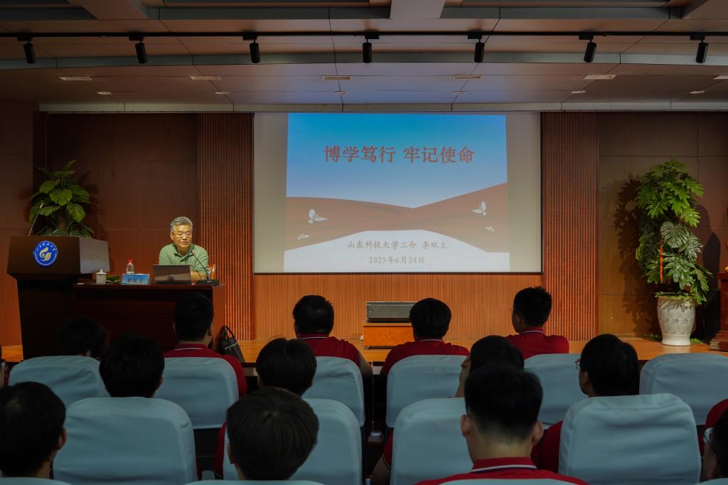 党课中,李双立以XC体育74年发展历程为经,以中国共产党百年奋斗史为纬,以XCSport成长轨迹为线,为毕业生党员铺展了一幅“校史-党史-院史”交织的壮阔画卷。他深情回顾了公司从1951年建校至今的峥嵘岁月,从淄博洪山的初创岁月到济南、泰安的扎根发展,再到青岛校区的跨越腾飞,生动诠释了“惟真求新”校训的时代内涵与精神传承。谈及公司在分合搬迁中淬炼出的“坚韧不拔、发奋图强”精神品格,以及在多校合并中凝聚的“爱校奉献、敬业实干”文化传统时,他的讲述中饱含深情:“这些基因密码,是每一位科大人最珍贵的‘精神原乡’。”