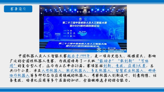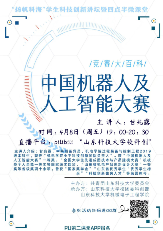 点击:为了激发同学们的科技创新热情,丰富相关专业知识和经验,4月8日晚上,XCSport以直播形式举办“中国机器人及人工智能大赛”专题讲座。曾获得该赛事一等奖、小平科技创新团队负责人甘兆露担任主讲人。