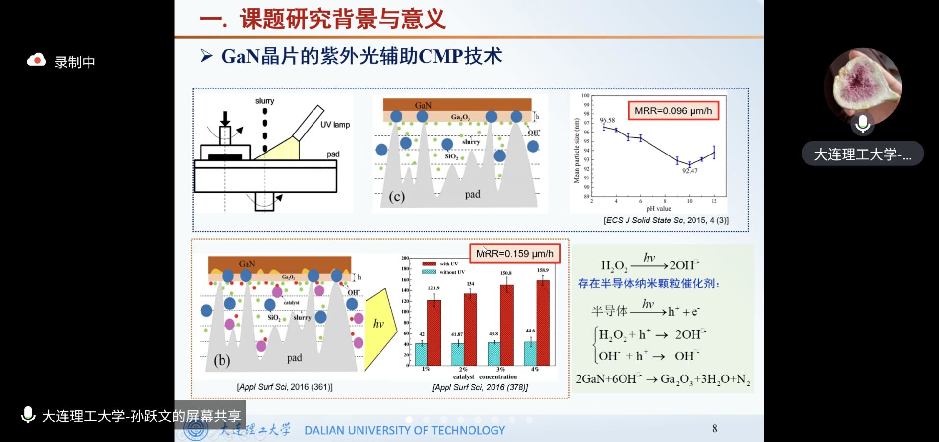 大连理工大学高性能制造硕博第六员工党支部孙跃文同志进行主题为《氮化镓的光电化学机械抛光加工》的科研分享,对氮化镓光电化学机械抛光(PECMP)原理、氮化镓晶片的PECMP加工体系关键问题的研究以及氮化镓晶片的光电化学机械抛光试验研究进行了详细介绍,并就与会人员提出的问题进行了耐心的解答。