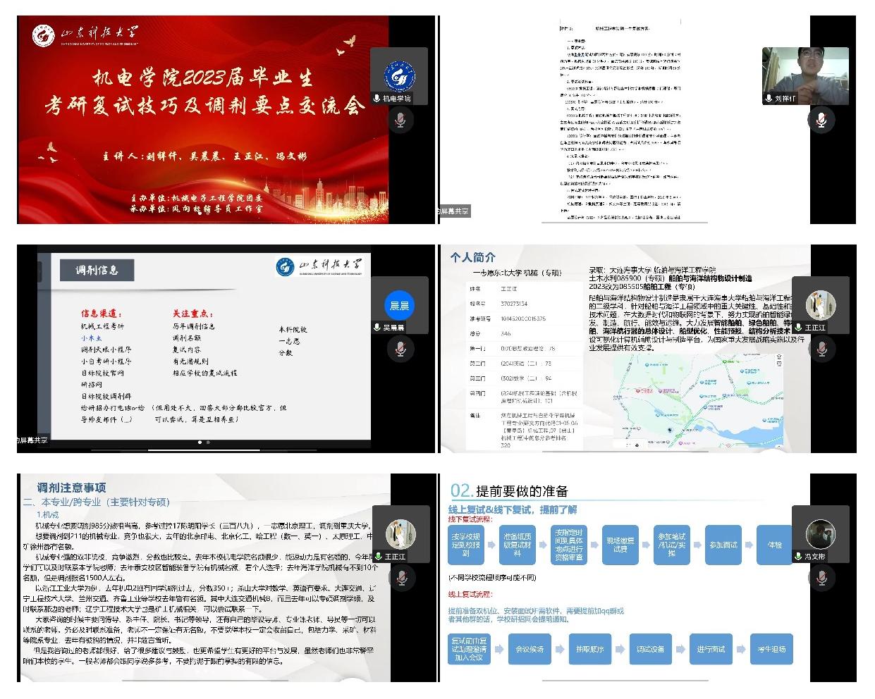 活动伊始,机电18-1班刘祥仟向同学们介绍了今年考研的大体情况,结合自身经历详细讲述了考研调剂的具体问题。刘祥仟在此基础上嘱咐同学们要明确自己的考研方向,同时要了解导师的研究方向和科研项目。机电18-1班王正江从考研准备、复习规划、院校专业选择等多个方面为同学们作了详细的指导和讲解。他提醒同学们考研一定要提前做好准备,不要打无把握的仗,在选择院校和专业时,要从多渠道了解报考公司的报考要求。机设18-1班吴晨晨和材料18-1班冯文彬两位学长也分别介绍了自己在考研路上所遇到的重重考验,给同学们提供了宝贵的经验。