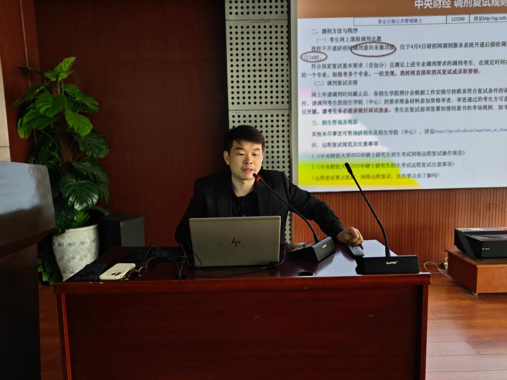 会议伊始,李有才从以下五个方面进行讲解:一是考研进入复试后该如何抢先一步联系导师;二是摸透导师遴选研究生的法则——省力法则;三是压线进入复试后,如何绝境反杀低分上岸;四是如何利用信息差优先调剂上岸;五是面试过程中千万不要触碰的大忌。随后,李有才就公司员工的可调剂院校的专业情况作了详细介绍,并对2023届毕业生考研形势作了初步分析,鼓励同学们要重视调剂。最后,李有才对XCSport的所有考研学子送上衷心的祝福。
